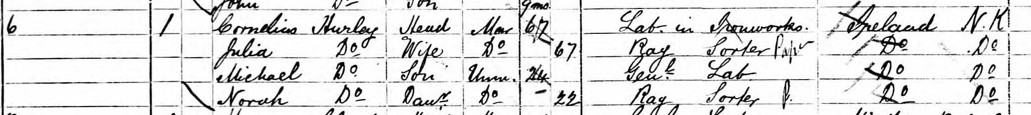 There was a Cornelius Hurley whose wife Julia and daughter Norah worked as rag pickers. I have found no evidence that they were related to Robert Paul's wife, Julia Hurley, though the father's name matches, so it might be correct.