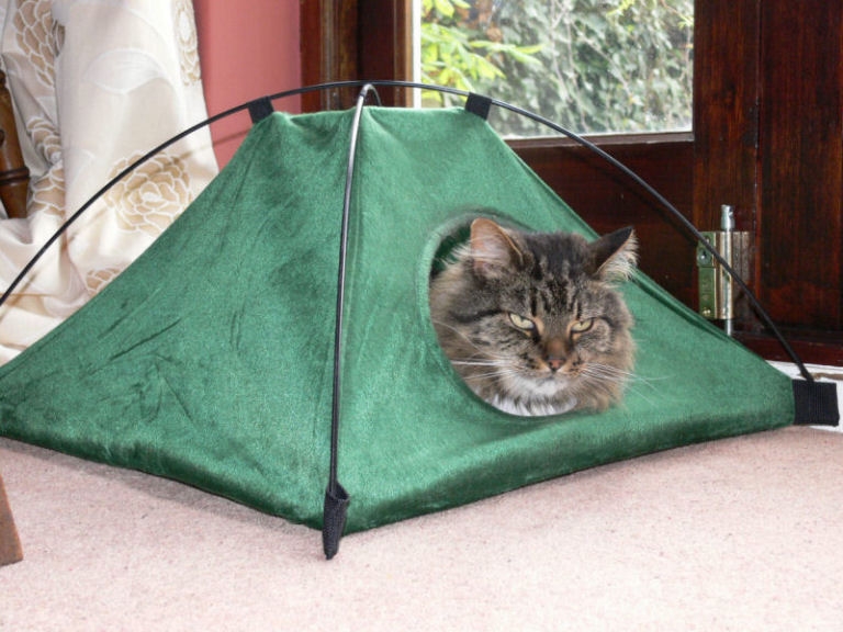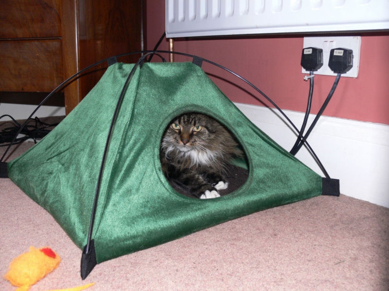 We snap him on the rare occasions we find him inside the tent. He never goes in when he thinks we are watching and we would not dare put him in ourselves. Besides the mass of fluff and claws we'd have to deal with, he'd never use the thing again and it would be straight down the charity shop.