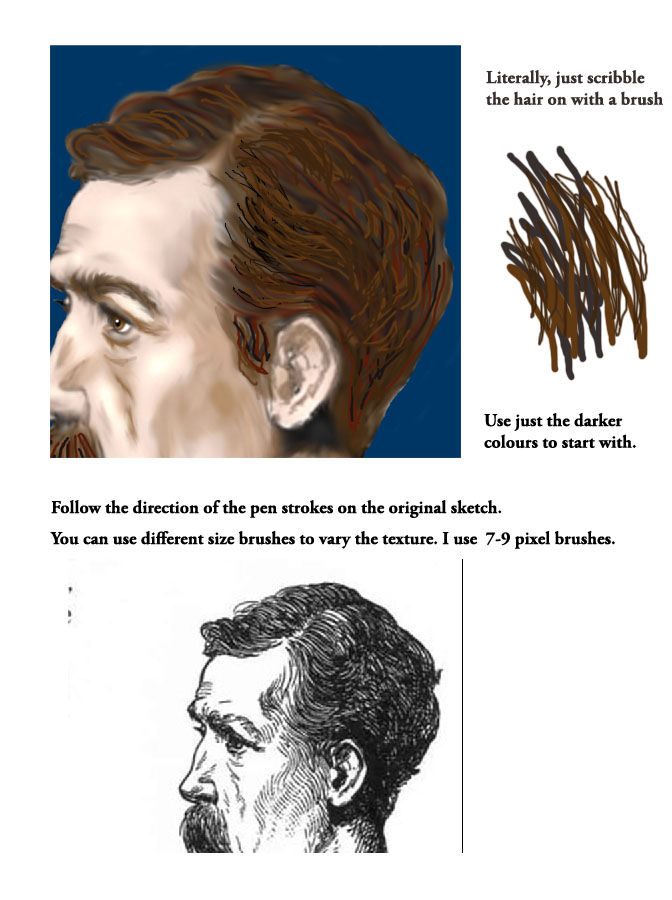 See sheet below on how to build up the hair. I'm using basic dark brown with a very slight reddish tint to it.