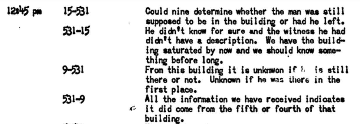 There's some very interesting information. Is the ricochet that is reported at 12:37 as having hit someone the one that hit Tague? There is a lot of talk about the shots coming from the third or fourth floors.I'm a short timer. But I can still think and have opinions. That's what I do.