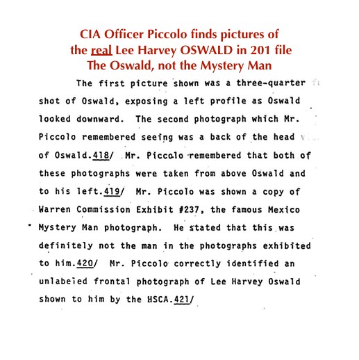 When CIA officer Piccolo opened the Lee Harvey Oswald 201 file; he saw two pictures of Oswald both from above and to left. When shown the MYSTERY MAN picture Piccolo stated definitely that was not the photo he saw in the 201 file.