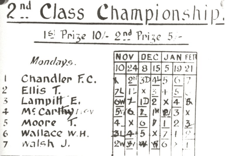 In the competition that Wallace was in everyone played each other with the usual chess point system of 1 for a win 1/2 for a draw and 0 for a defeat. Wallace had only played one game which was against Lampitt on the 10th of November (which he lost) so it was just over 2 months since he’d played. That doesn’t necessarily mean that he hadn’t attended though as he could have turned up and not played a match (maybe potential opponents were playing against each other?)