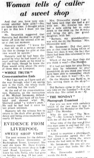 I don't and can't dispute what you say. I suppose I just find it hard to regard Mrs D as (purely) a defence witness given her insistence at Swanwick's prompting that ''this conversation took place on the Monday'' which undermined Hanratty's claim and presumably contributed to the guilty verdict.