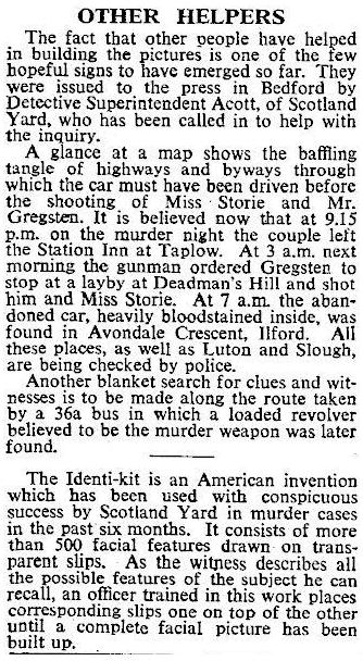 VS helped Jock Mackie to compile that Identikit photo just 3 short days after the murder, when the image of her attacker's face was freshest in her mind. She understood full well the great importance of giving Sgt Mackie the most accurate description of her attacker as possible. She didn't know on that Saturday afternoon if she would survive her bullet wounds and her most fervent wish must have been for MG's murderer (and her rapist) to be found. Consequently, great care must have been taken in compiling that Identikit photo. Scotland Yard had been using the impressive technique with great success for the previous five or six months since it's introduction from the USA.