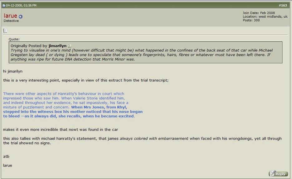 That's quite damaging if Hanratty only added Tarleton Road in the wake of Mrs Dinwoodie's evidence. Giving two very common, but distinct street names - Carlton or Talbot - in the first place didn't do him that much of a favour.