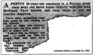 The Appeal describes Louise Anderson as “his girlfriend” which seems to be going too far. Although in the Daily Mirror, two days before the article above, she described their first meal this way: “He asked me to go out with him. I said I would. The following Sunday he came round for me and we went to a restaurant in the Bayswater Road.” (If a Sunday it would have been 13-Aug-61, but some reports say it was the day before.) She is complimentary about him in that article.