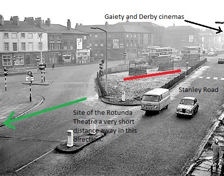 The gent's and ladie's toilets which he mentioned are underlined in red in the photo. Also, as indicated in the photo by a green arrow, there was the site of the famous Rotunda Theatre a very short distance away. I don't know what stood on the site back in August 1961 as the theatre was bombed in the May blitz of 1941.
