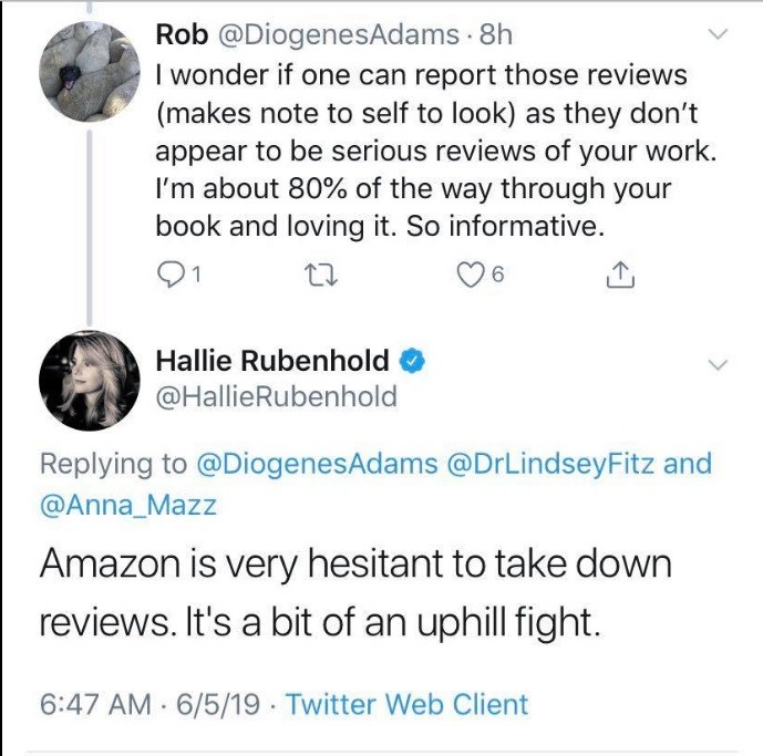 Hallie Rubenhold has complained about the difficulty of removing unfavourable reviews from Amazon.