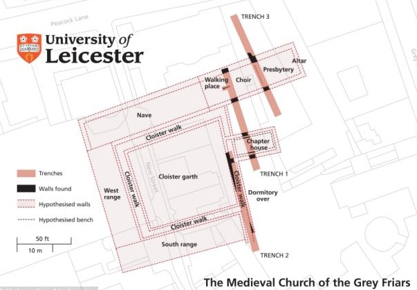 "The body of an adult male has been excavated from what is believed to be ruins of the choir area of the Grey Friars church in Leicester." I assume this corresponds with Trench 1 which crosses the choir.