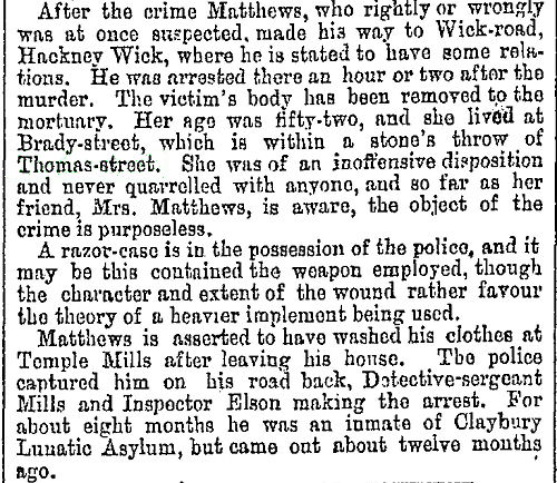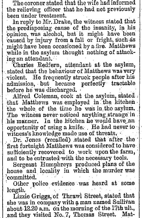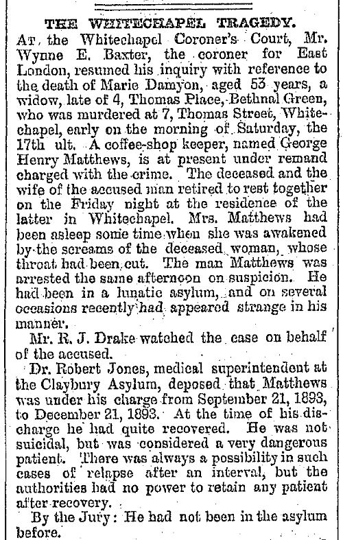 George Henry Matthews (possible alias John Bailey) had been an inmate of Clabury asylum some time in his past. He doesn't appear to have actually stood trial for this particular 1894 murder, his case was taken out of the hands of the Worship street magistrates when Matthews was deemed dangerous, violent and certified a dangerous lunatic and sent to Broadmoor asylum. This caused a bit of a legal wrangle as to what should be entered into the court records. "Removed to an asylum by secretary of States Order" was finally recorded.